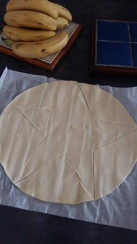 - Prenez les morceaux de pâte feuilletée mis de côté et replacez-les au dessus des pointes de votre étoile. Placez-en également au centre où se situe vos morceaux de banane.